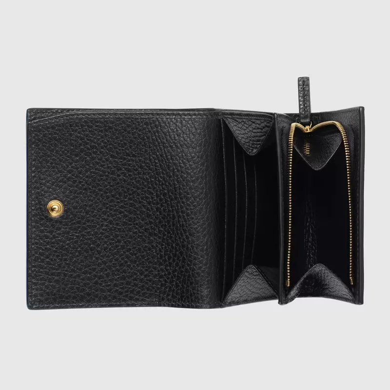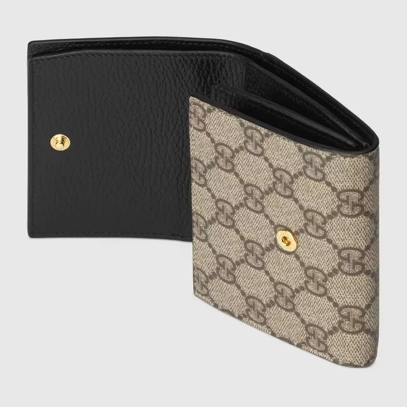 GGスプリーム キャンバスとブラックレザーを組み合わせ グッチを象徴するダブルGの小さなハードウェアをあしらったミディアムサイズのウォレット。内側には複数のカードスロットとポケットを備えており スナップ クロージャーで開閉するデザインです。